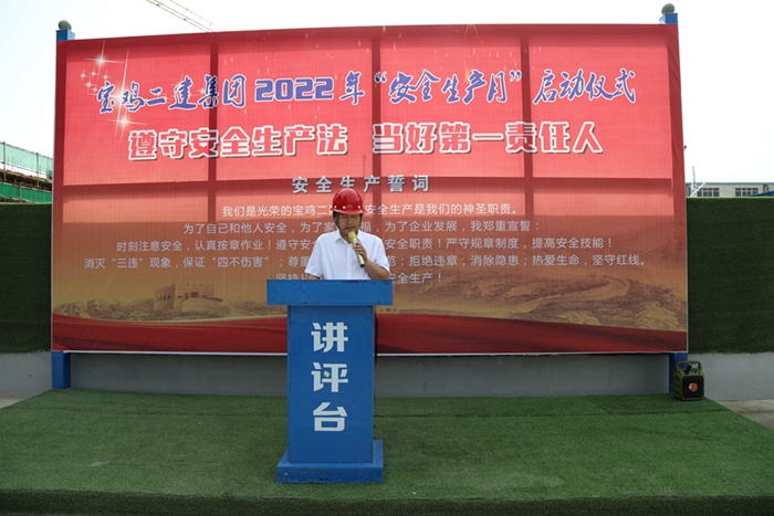 總經(jīng)理?xiàng)罱桨l(fā)表講話。他表示,今天是端午佳節(jié),集團(tuán)公司召開“安全生產(chǎn)月”啟動(dòng)儀式暨動(dòng)員大會,意義非凡,他代表集團(tuán)公司向節(jié)日期間堅(jiān)守奮戰(zhàn)一線的員工們致以崇高的敬意和美好的祝福,并對“安全生產(chǎn)月”活動(dòng)提出三點(diǎn)要求:一是充分認(rèn)識開展“安全生產(chǎn)月”活動(dòng)的重要性,學(xué)習(xí)安全生產(chǎn)法,做到守法履責(zé)。二是持續(xù)開展“安全生產(chǎn)萬里行”,認(rèn)真做好“安全生產(chǎn)月”活動(dòng),分類強(qiáng)化安全生產(chǎn)警示教育。三是高度重視、強(qiáng)化統(tǒng)籌,建立“安全生產(chǎn)月”長效機(jī)制。他強(qiáng)調(diào),安全生產(chǎn)是企業(yè)的頭等大事,要以此活動(dòng)為契機(jī),廣泛開展《安全生產(chǎn)法》主題宣傳活動(dòng),要始終把安全生產(chǎn)放在第一位,持續(xù)深入學(xué)習(xí)貫徹習(xí)近平總書記關(guān)于安全生產(chǎn)重要論述,積極推動(dòng)落實(shí)安全生產(chǎn)十五條措施,統(tǒng)籌理解安全與發(fā)展的關(guān)系,進(jìn)一步凝聚安全生產(chǎn)發(fā)展共識,弘揚(yáng)安全文化,促進(jìn)集團(tuán)公司安全生產(chǎn)形勢持續(xù)穩(wěn)定。